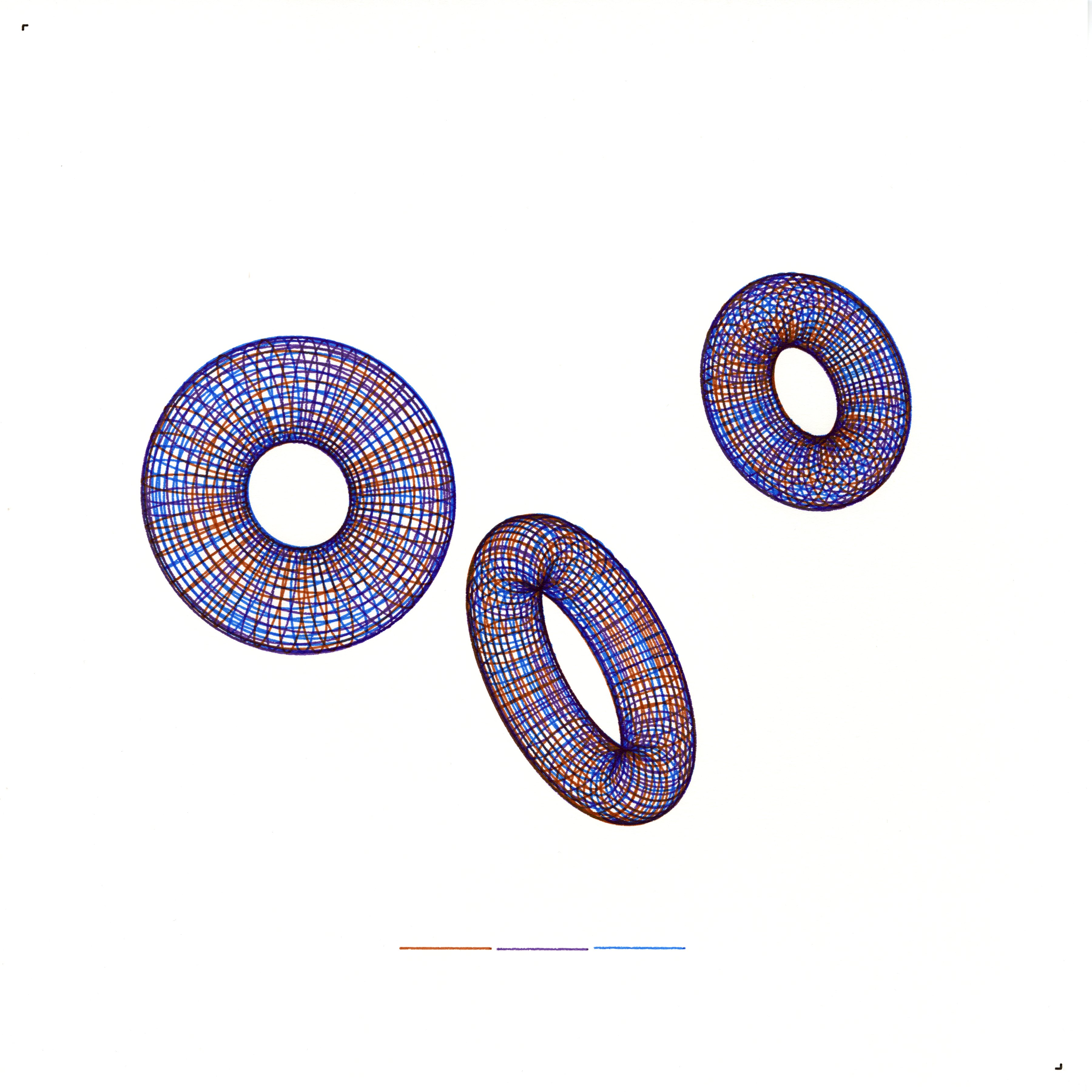 Orbital Tori envisions a constellation of toroidal forms arranged in a shared field, each one representing a distinct perspective within a cohesive identity. The lattice of major and minor loops embodies an interplay between structure and fluidity, while the open centres hint at the potential for transformation. Subtle positional offsets keep each torus in proximity yet grant it enough space to be viewed independently, reflecting how multiple facets of self can coexist without merging into a single perspective. Through these overlapping shapes and measured distances, the composition highlights both the unity and the complexity of identity: a tapestry of viewpoints woven together in a common orbit.