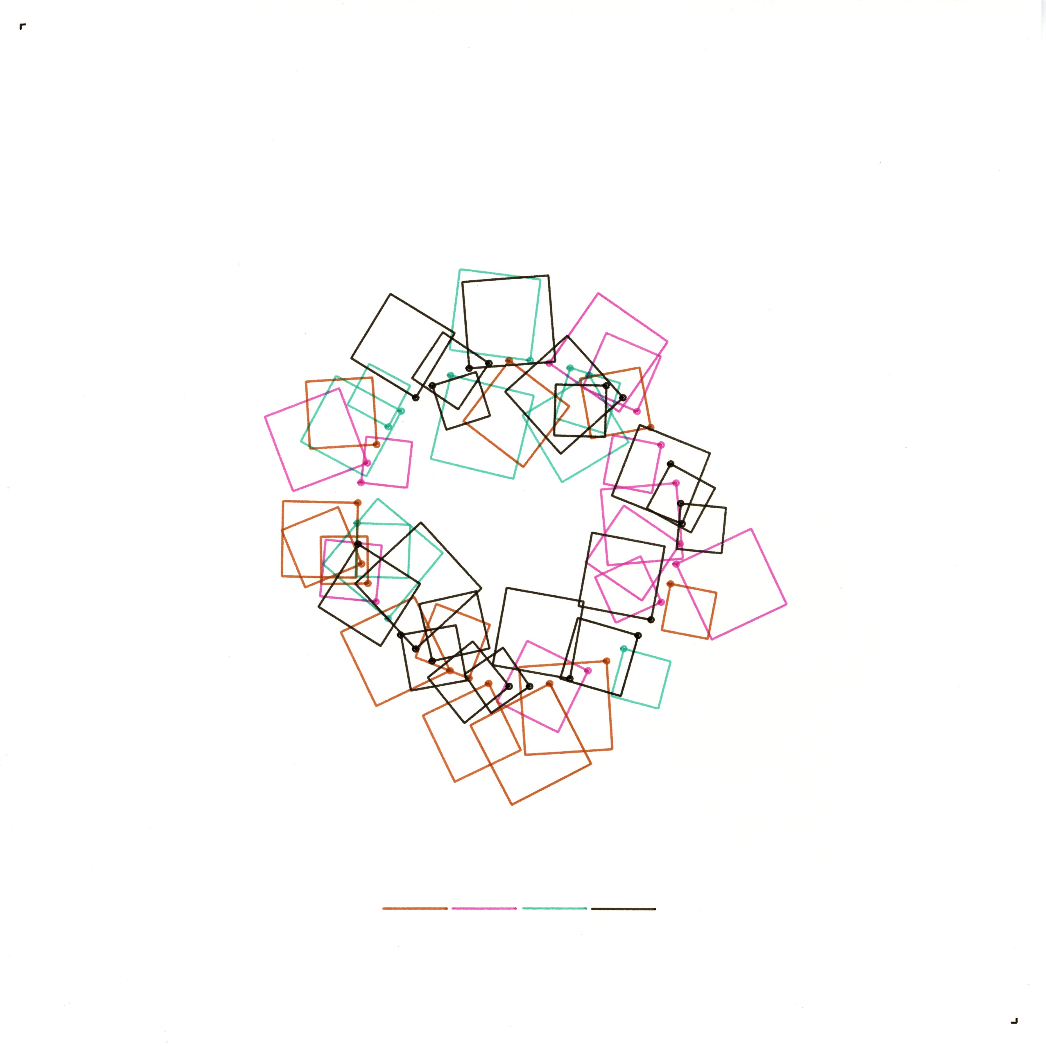 Circular Tethers arranges a set of squares around an invisible ring, each square’s corner anchored to a designated point on the circle. The anchor point is highlighted with a small circle, emphasizing how each perspective springs from a shared foundation yet maintains its own rotation and scale. Through this design, I explore the tension between a unifying core (the ring) and the diversity of viewpoints (the squares), reflecting the balance between commonality and individuality in my sense of self.