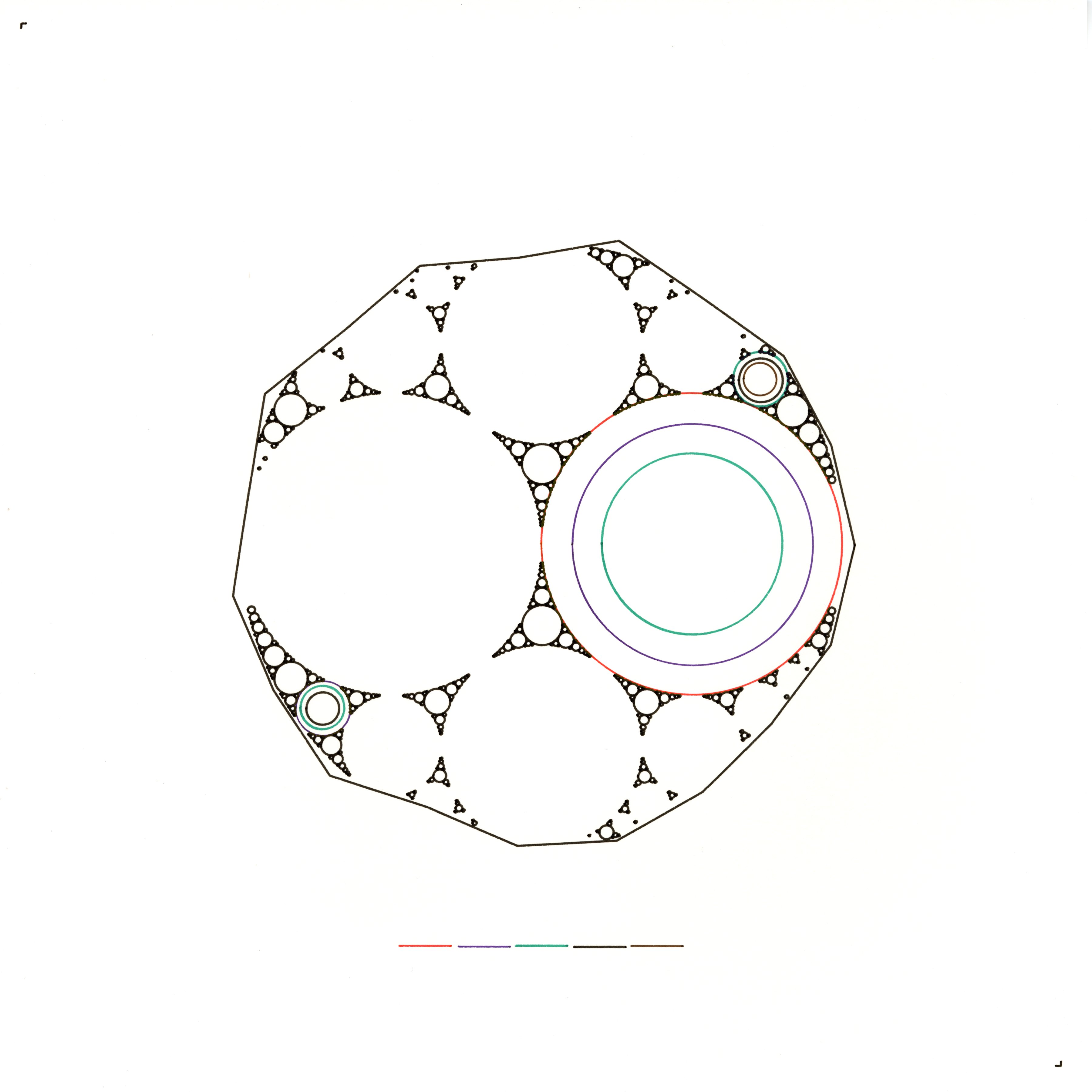 In Apollonian Reflection, I perceive my identity as a fractal arrangement of circles within a polygon boundary. Each circle arises in tangential dialogue with its neighbours, so that no one shape can expand without meeting others. This interplay mirrors how distinct facets of my being interact—nesting into available space while contributing to a unified, ever-evolving tapestry. The emergent pattern hints at a deeper structure beneath apparent complexity: every circle, though separate, depends on mutual touchpoints to create a coherent whole. By weaving these tangential relationships in a geometric boundary, I reflect on how my identity can be both discretely faceted and seamlessly integrated, revealing the delicate balance of self in an interconnected world.