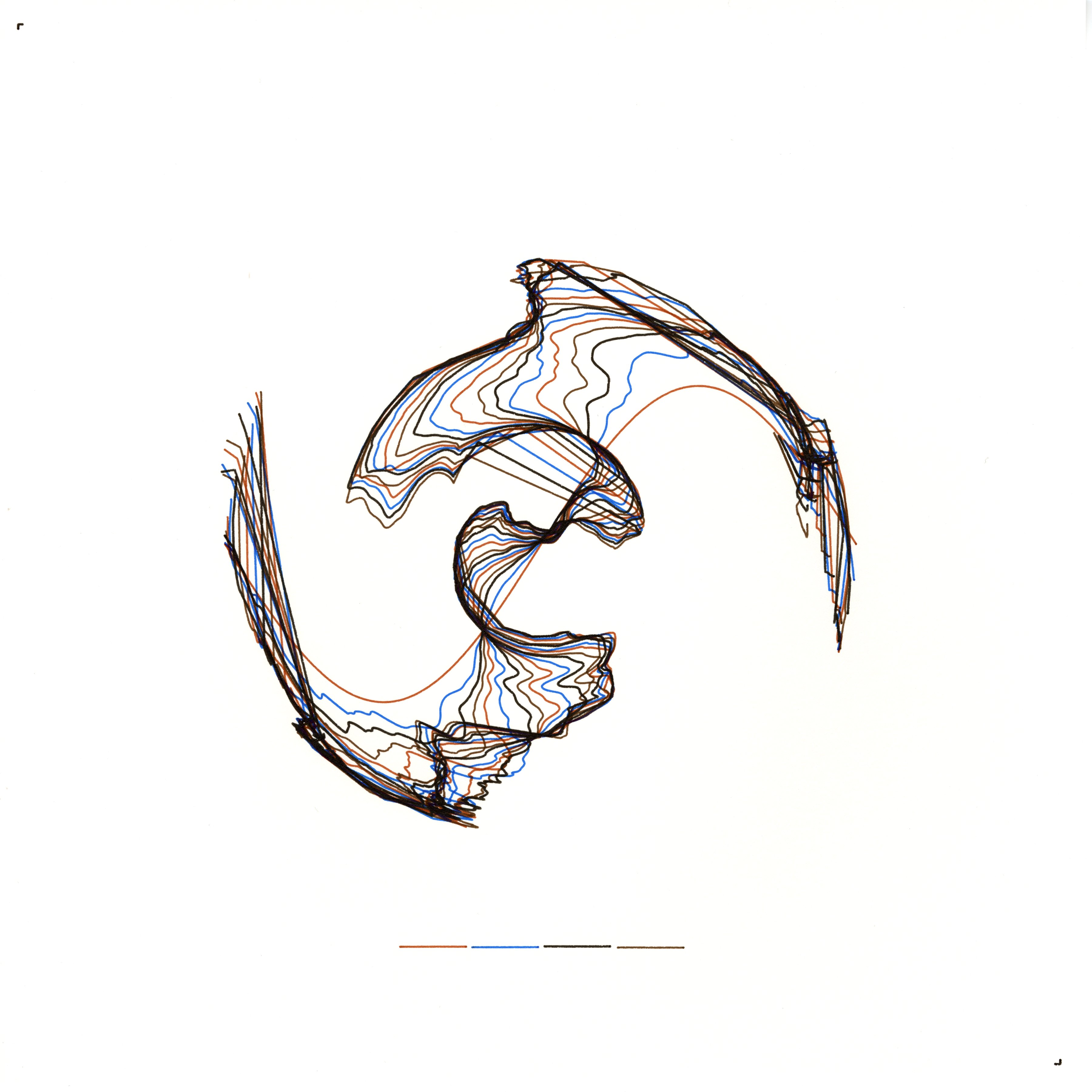 Affine Anomaly explores the notion of identity as a process of iterative transformation. A simple base curve—representing a snapshot of self—is continuously warped through noise-influenced affine distortions. Each iteration applies a small rotation, scaling, and translation (all derived from Perlin noise) to the curve relative to a fixed central reference. The resulting series of curves portrays the fluid evolution of self while maintaining a coherent underlying structure. Each iteration is assigned a unique colour from a preselected palette, and the drawing is carefully recorded so that the canvas rendering is in perfect alignment with the SVG export.