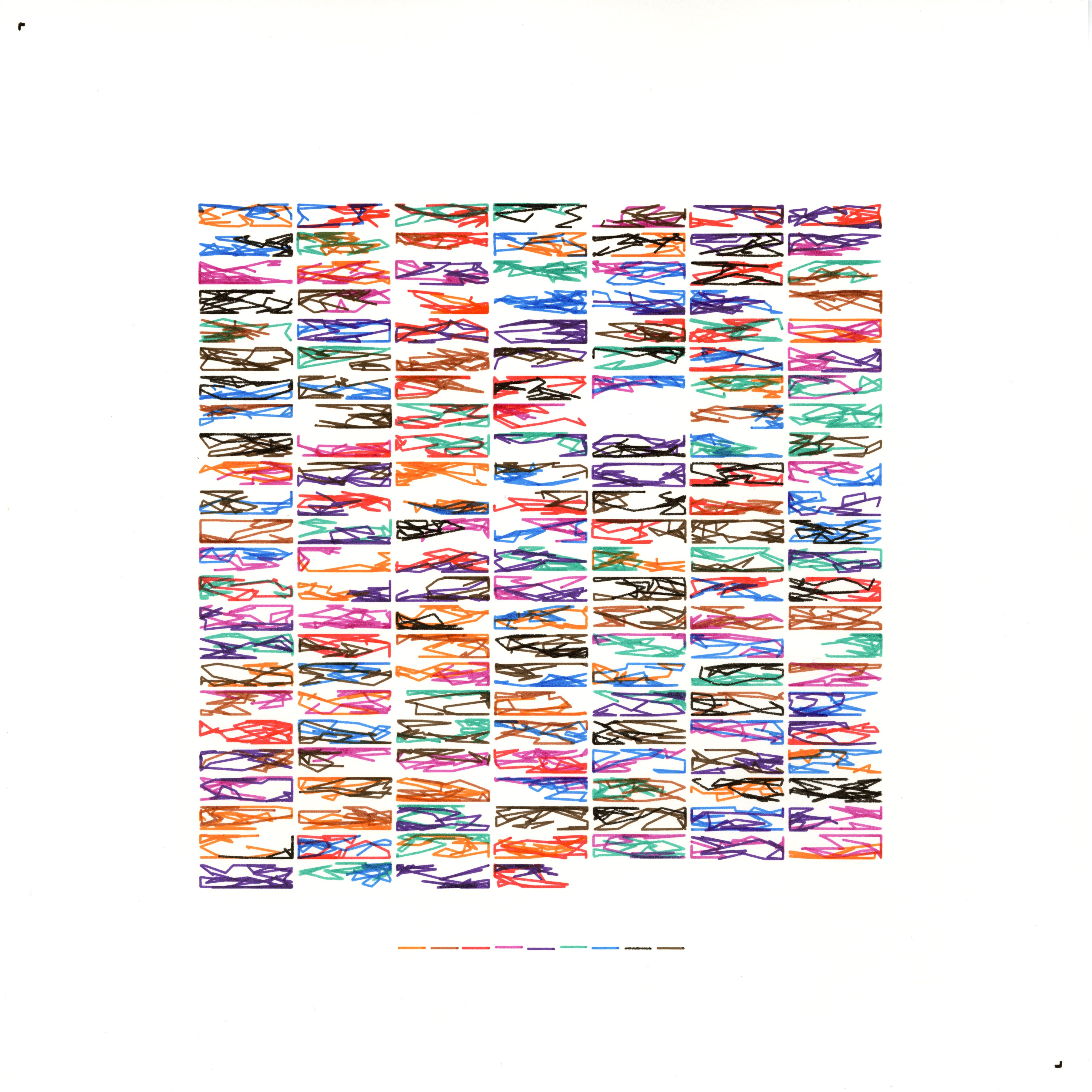 Mosaic of Self-Reflections divides my inner world into 165 patches arranged in a grid of 7 columns and enough rows to cover all days. Out of these, one patch—the 54th—is intentionally left empty to honour the day we missed, while the other 164 patches display generative curves that capture different facets of my evolving identity. This patchwork embodies a continuous self, composed of discrete yet interlocking moments.