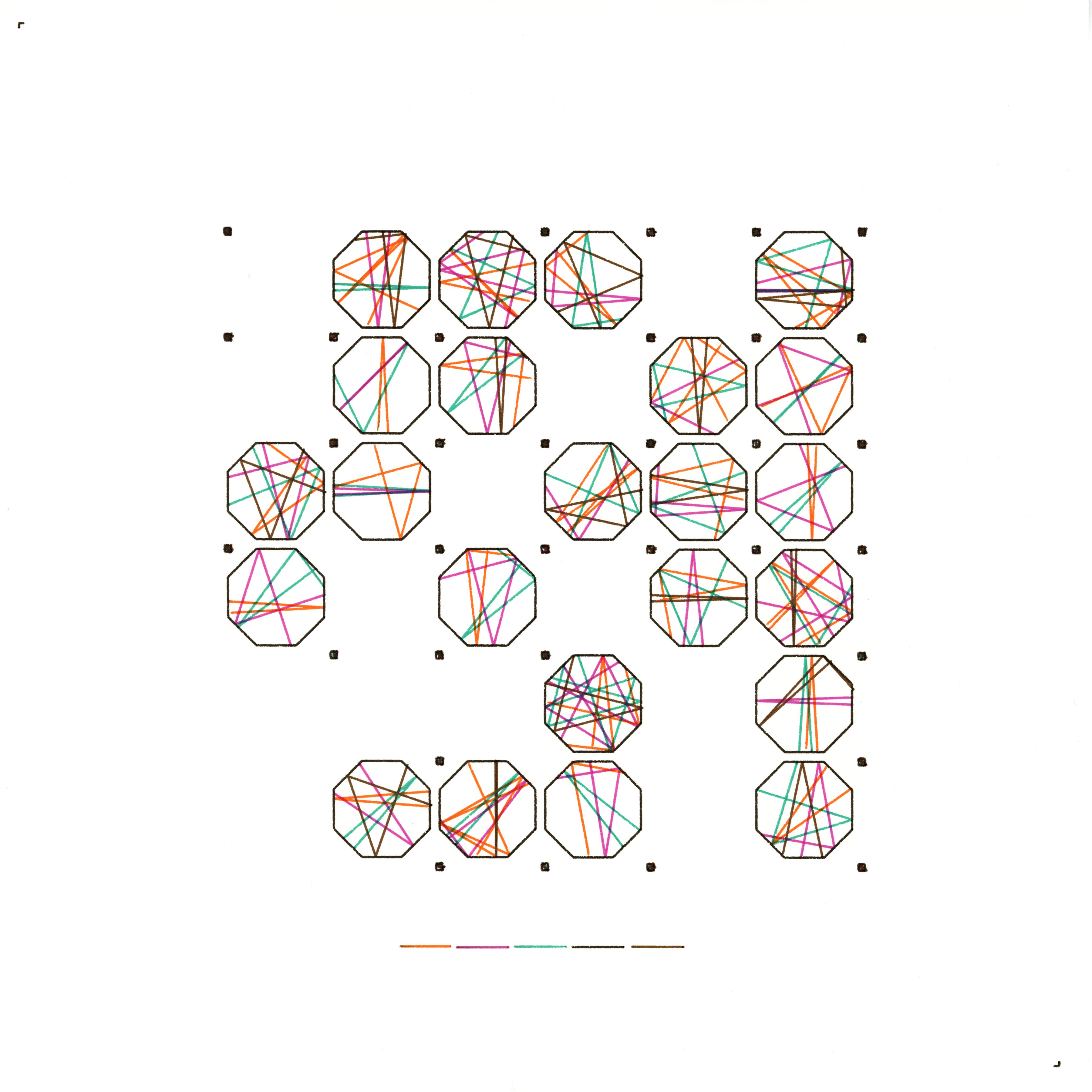 Specular Tessellation imagines my interior architecture as a flawless grid that never quite finishes assembling itself. Each potential chamber—square, hexagon, or octagon–square pair—offers a pristine surface for thought, yet a hidden probability gate decides which chambers are allowed to exist. Accepted polygons declare geometric certainty; rejected ones become deliberate voids that expose the brittleness of order. Inside the occupied cells, narrow beams of coloured light ricochet from edge to edge, tracing mirror-perfect reflections until their energy dissipates. The completed paths celebrate logical precision, while the blank plots insist that omission is an equal partner in meaning. Together they form a portrait of identity as a balance between what is articulated and what is withheld.