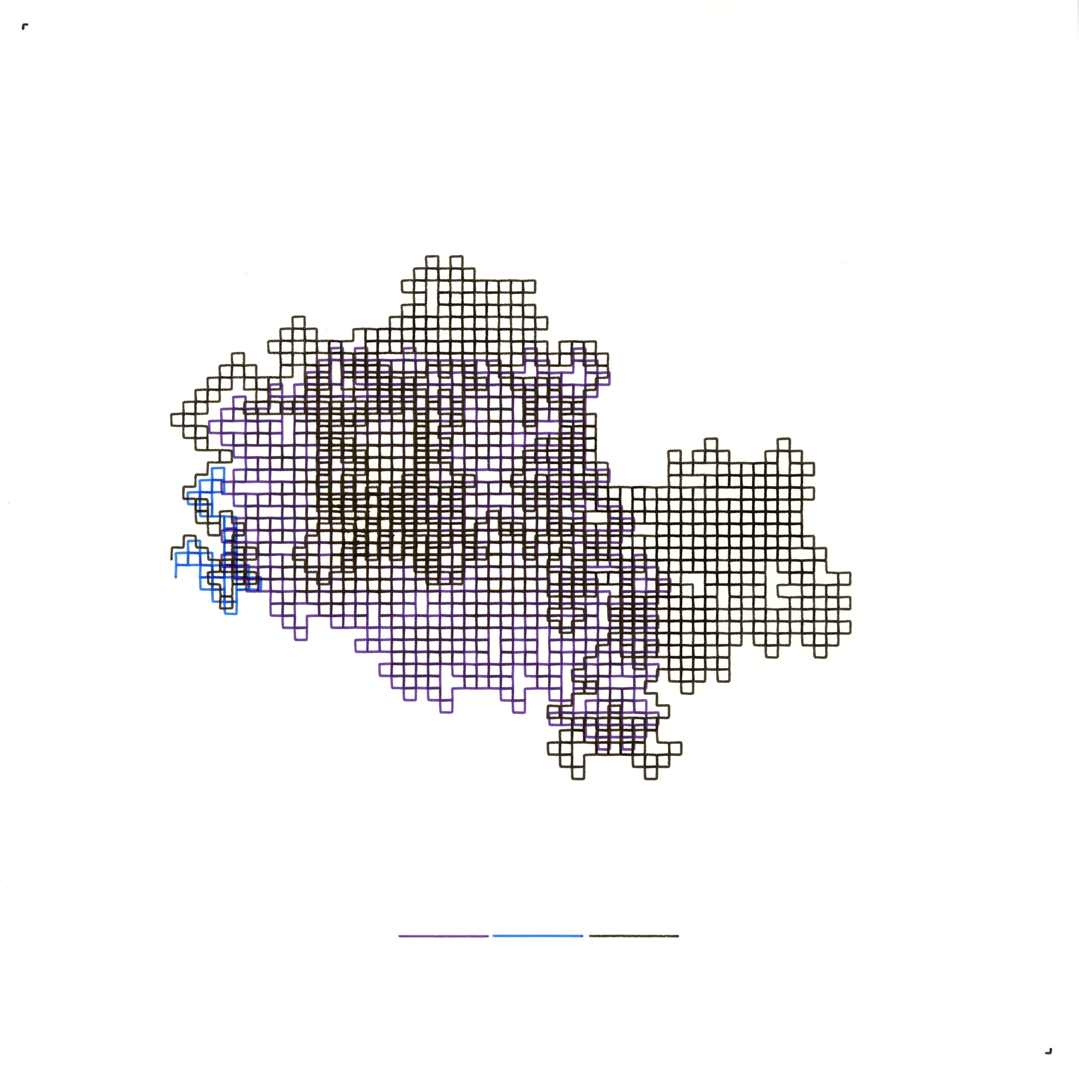 I picture my inner life as a caravan of simple travellers that carve invisible highways while obeying only the tiniest scraps of instinct. Each traveller moves across a silent grid, turning left or right according to the colour of the square beneath its feet before repainting that square and pressing on. Individually their steps seem arbitrary, but together they accumulate into avenues wide enough to reshape the landscape. Today’s portrait traces several of these pilgrims as they criss-cross an open field, their slender threads intersecting freely yet never covering the same ground in exactly the same way. The drawing captures the moment when a hidden order begins to surface—an emergent lattice vibrating between habit and revelation.