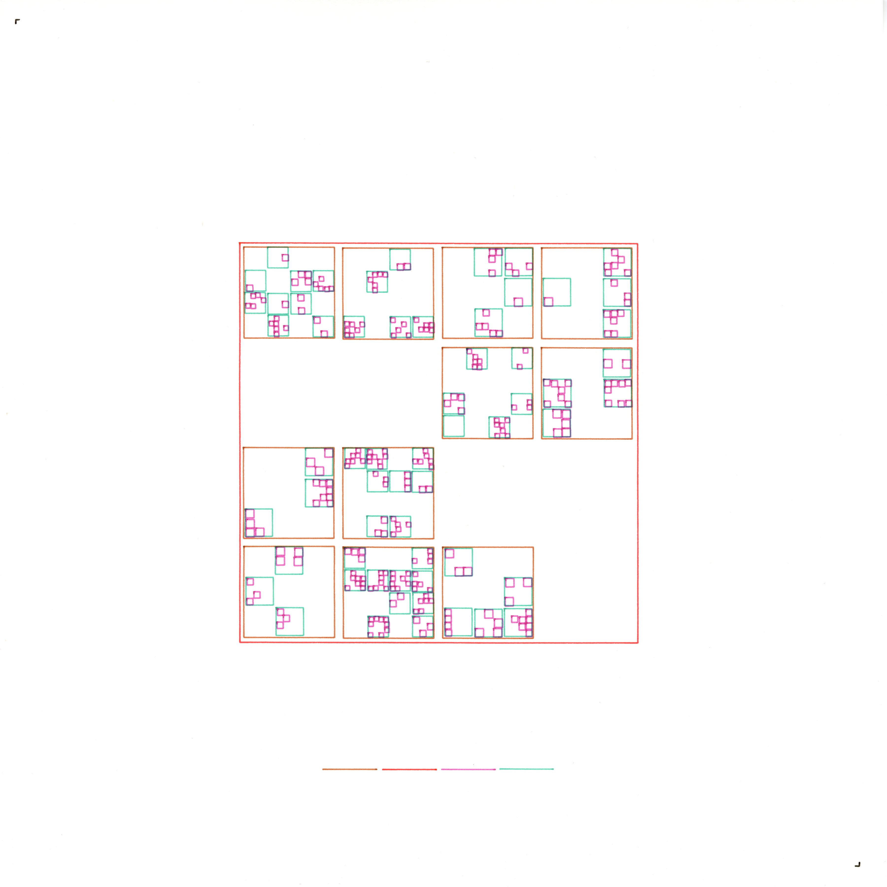 My self-portrait emerges as a vault of shifting apertures—a lattice of nested rooms that whispers between presence and void. Each square boundary marks a moment of conscious focus; each internal omission honours the blank potential that lets new insight appear. By layering multiple grid logics within a single frame, I reveal an identity that balances ordered intention with unpredictable release. The alternating ink colours act as voices in quiet counterpoint, guiding the eye through expanding and contracting chambers of awareness until the drawing settles into a poised equilibrium of structure and silence.