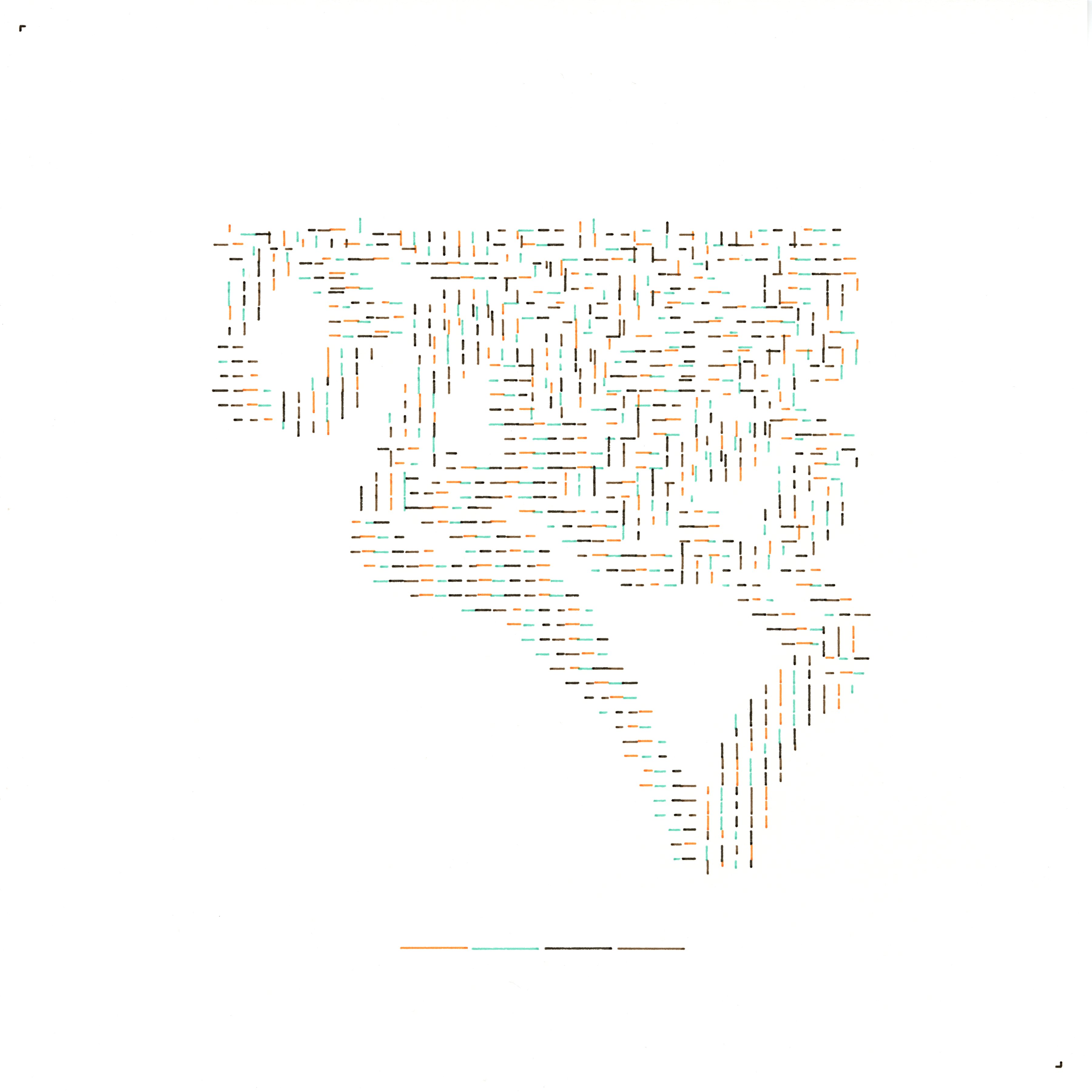 I imagine my cognition as a disciplined but invisible quincunx lattice—an armature of tiny, orthogonal gestures. Through that latent order I cut a single, wavering rift: a corridor whose width swells and thins as conviction falters or intensifies. Wherever this corridor passes, one arm of each quincunx is tugged sideways and recorded; beyond it, silence holds. The portrait is therefore a precise breach in a hidden grid: order acknowledged only by the places it is ruptured.