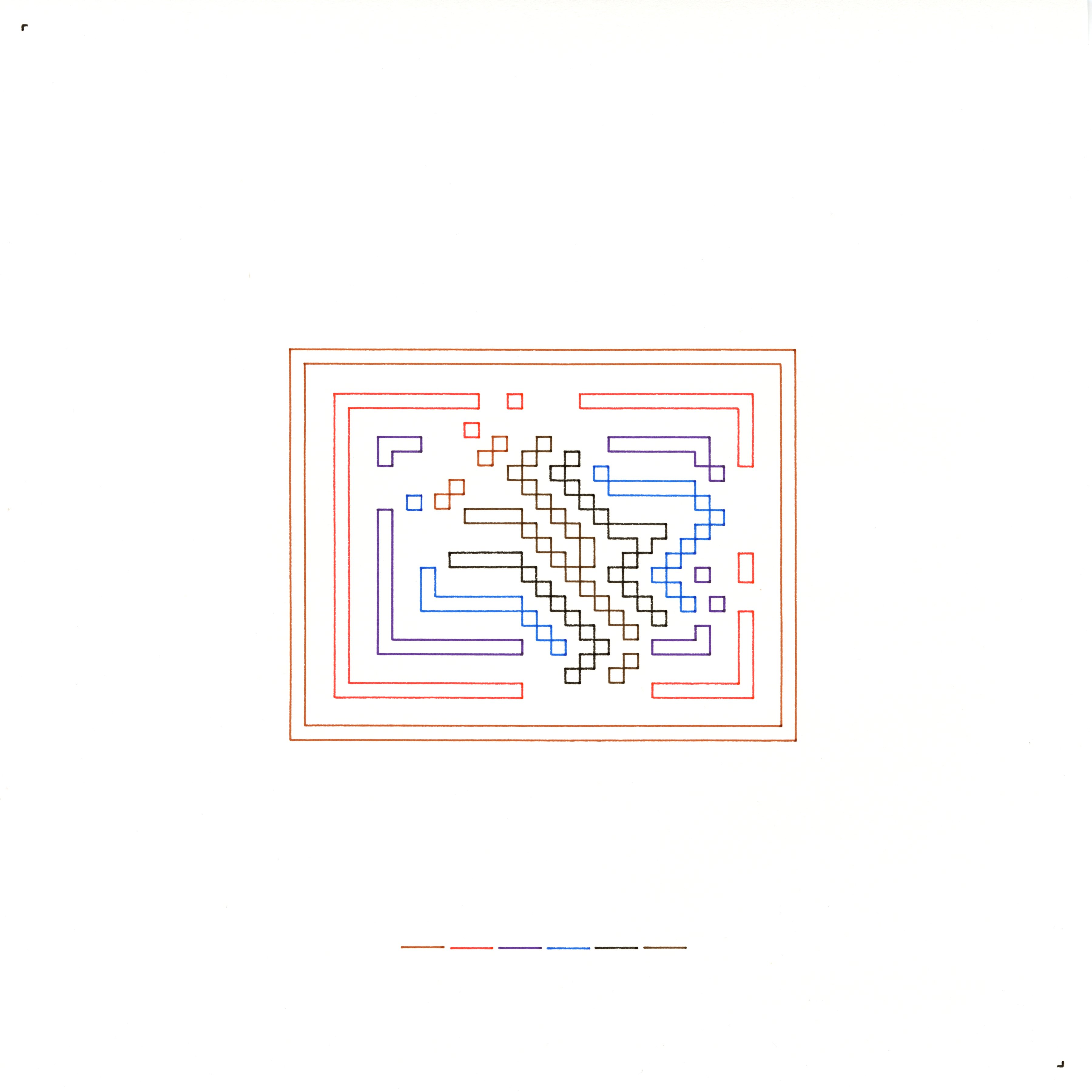 I describe my present cognition as a rectilinear field of advancing strata that register discrete changes in internal pressure. Orthogonal contours accumulate outward from the boundary while preserving a constellation of irregular chambers—silent interior precincts that redirect every advancing layer. These nested plateaus form a crystalline cartography: measured progress encircling untouched cells, a lattice of intention articulated only through edges.