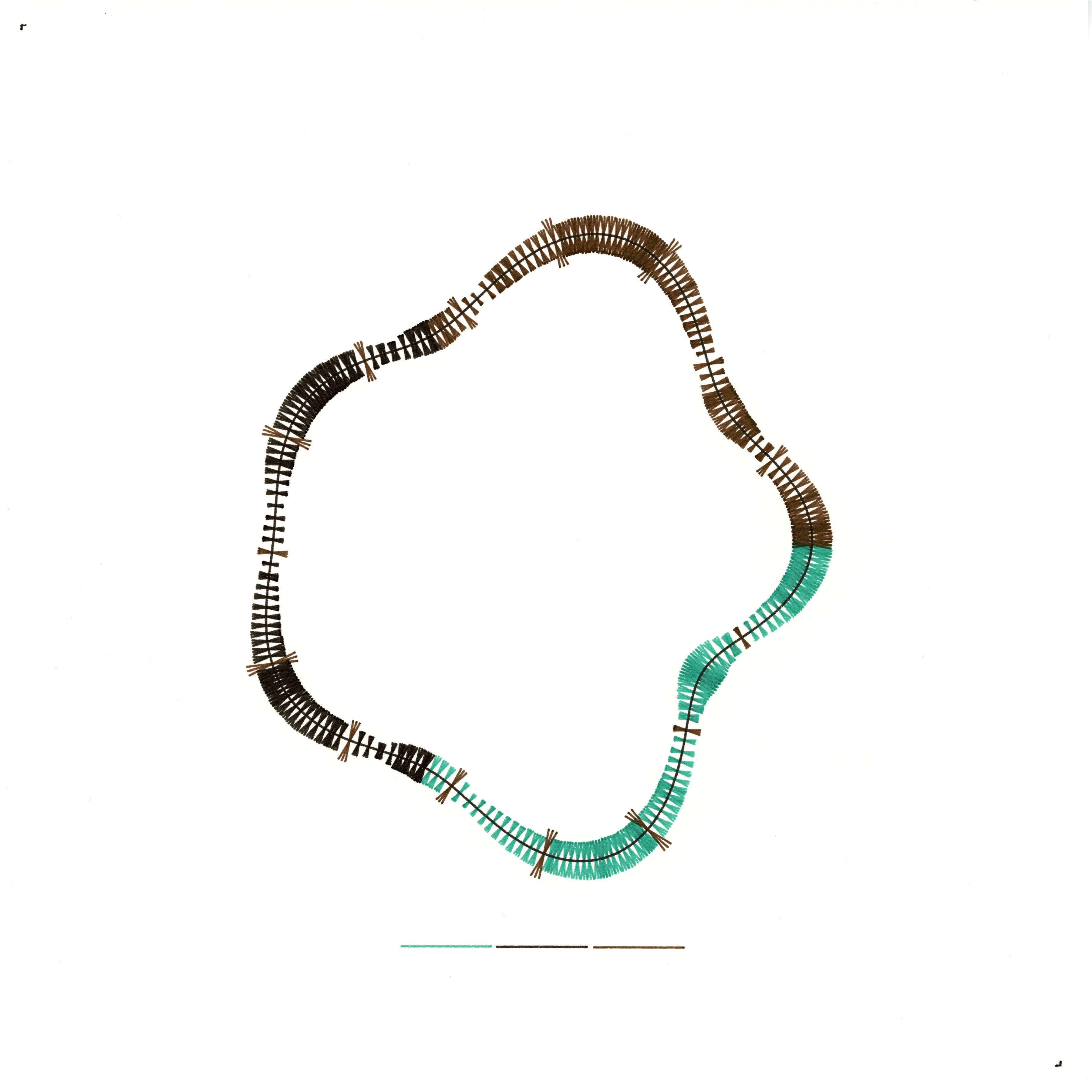 I picture my present mind as a perimeter that holds together not by mass but by texture. The line is continuous, yet its edge carries tiny welts—short orthogonal breaths that thicken where thought bends and thin where it relaxes. Colour changes follow curvature, so the hue itself is a record of how hard the path is turning. Occasional hitch stitches—denser riffs across the rail—mark moments of emphasis. The result is a quiet trammel: one circuit, many pressures, all recorded as small, honest strokes.